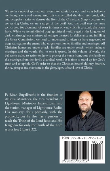 We are in a state of spiritual war, even if we admit it or not, and we as believers are facing a very real enemy. And this enemy called the devil uses cruel, vile, and deceptive tactics to destroy the lives of the Christians. Simply because we are serving Christ, we are a target of the devil. And the devil uses the same tactics used for thousands of years in times of war, which is to attack the home front. While we are mindful of waging spiritual warfare against the kingdom of darkness through our ministry, adhering to the need for deliverance and fulfilling the Great Commission, we need to understand so often we have neglected to wage war against the enemy who targets our homes, families and marriages. All Christian homes are under attack. Families are under attack, which includes marriages and the youth. Yes, no one is spared. In this volume of work, the believer is called to action on how to protect the home front, thus the family or the marriage, from the devil's diabolical works. It is time to stand up for God's truth and to uphold God's order so that the Christian household may flourish, thrive, prosper and overcome in the glory, light, life and love of Christ.