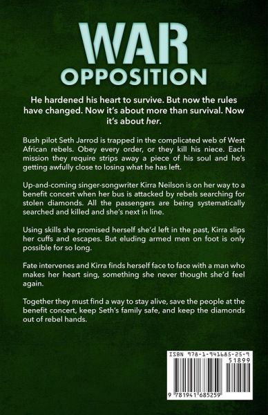 He hardened his heart to survive. But now the rules have changed. Now it's about more than survival. Now it's about her. Bush pilot Seth Jarrod is trapped in the complicated web of West African rebels. Obey every order, or they kill his niece. Each mission they require strips away a piece of his soul and he's getting awfully close to losing what he has left. Up-and-coming singer-songwriter Kirra Neilson is on her way to a benefit concert when her bus is attacked by rebels searching for stolen diamonds. All the passengers are being systematically searched and killed and she's next in line. Using skills she promised herself she'd left in the past, Kirra slips her cuffs and escapes. But eluding armed men on foot is only possible for so long. Fate intervenes and Kirra finds herself face to face with a man who makes her heart sing, something she never thought she'd feel again. Together they must find a way to stay alive, save the people at the benefit concert, keep Seth's family safe, and keep the diamonds out of rebel hands. If you like dark, gritty, edge-of-your-seat action, strong heroes and heroines who are pushed to their physical and moral limits, and an international setting, then you'll love the third book in Vanessa Kier's romantic thriller series, WAR. Get WAR: Opposition now to start the adventure!