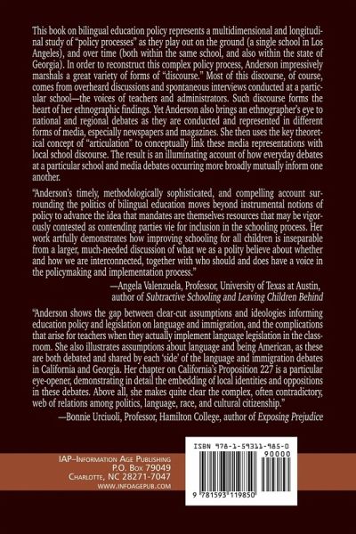 A volume in Education Policy in Practice: Critical Cultural Studies Series Editors Bradley A. U. Levinson, and Margaret Sutton, Indiana University This book on bilingual education policy represents a multidimensional and longitudinal study of "policy processes" as they play out on the ground (a single school in Los Angeles), and over time (both within the same school, and also within the state of Georgia). In order to reconstruct this complex policy process, Anderson impressively marshals a great variety of forms of "discourse." Most of this discourse, of course, comes from overheard discussions and spontaneous interviews conducted at a particular school-the voices of teachers and administrators. Such discourse forms the heart of her ethnographic findings. Yet Anderson also brings an ethnographer's eye to national and regional debates as they are conducted and represented in different forms of media, especially newspapers and magazines. She then uses the key theoretical concept of "articulation" to conceptually link these media representations with local school discourse. The result is an illuminating account of how everyday debates at a particular school and media debates occurring more broadly mutually inform one another. Reviews: Anderson's timely, methodologically sophisticated, and compelling account surrounding the politics of bilingual education moves beyond instrumental notions of policy to advance the idea that mandates are themselves resources that may be vigorously contested as contending parties vie for inclusion in the schooling process. Her work artfully demonstrates how improving schooling for all children is inseparable from a larger, much-needed discussion of what we as a polity believe about whether and how we are interconnected, together with who should and does have a voice in the policy making and implementation process. -Angela Valenzuela, Professor, University of Texas at Austin, author of Subtractive Schooling and Leaving Children Behind Anderson shows the gap between clear-cut assumptions and ideologies informing education policy and legislation on language and immigration, and the complications that arise for teachers when they actually implement language legislation in the classroom. She also illustrates assumptions about language and being American, as these are both debated and shared by each "side" of the language and immigration debates in California and Georgia. Her chapter on California's Proposition 227 is a particular eye-opener, demonstrating in detail the embedding of local identities and oppositions in these debates. Above all, she makes quite clear the complex, often contradictory, web of relations among politics, language, race, and cultural citizenship. --Bonnie Urciuoli, Professor, Hamilton College, author of Exposing Prejudice