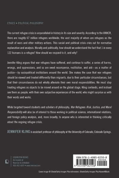 The current refugee crisis is unparalleled in history in its size and severity. According to the UNHCR, there are roughly 67 million refugees worldwide, the vast majority of whom are refugees as the result of wars and other military actions. This social and political crisis cries out for normative explanation and analysis. Morally and politically, how should we understand the fact that 1 in every 122 humans is a refugee? How should we respond to it, and why? Jennifer Kling argues that war refugees have suffered, and continue to suffer, a series of harms, wrongs, and oppressions, and so are owed recompense, restitution, and aid-as a matter of justice-by sociopolitical institutions around the world. She makes the case that war refugees should be viewed and treated differently than migrants, due to their particular circumstances, but that their circumstances do not wholly alleviate their own moral responsibilities. We must stop treating refugees as objects to be moved around on the global stage, Kling contends, and instead see them as people, with their own subjective experiences of the world, who might surprise us with their words and works. While targeted toward students and scholars of philosophy, War Refugees: Risk, Justice, and Moral Responsibility will also be of interest to those working in political science, international relations, and foreign policy analysis, and, more broadly, to anyone who is interested in thinking critically about the ongoing refugee crisis.