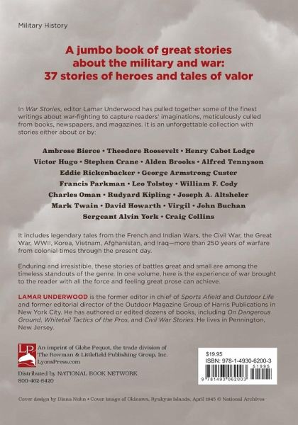 A collection of great war stories! Here is a jumbo book of tales of courage and valor: 37 stories in all. * Our Classics and Greatest Stories series have a proven track record * Readers love tales of honor, courage, and valor * We have successfully re-launched the Greatest Stories series with Special Ops and Snipers * Unlike other books that focus on one war or conflict, this includes tales from more than 250 years of warfare in North America In War Stories, editor Lamar Underwood has pulled together some of the finest writings about war-fighting that capture readers imaginations. It includes legendary tales from the French and Indian Wars, the Civil War, the Great War, WWII, Korea, Vietnam, and Iraq – more than 250 years of warfare from colonial times up through the present day. This unforgettable collection includes stories by: *Baron Manfred Von Richthofen *Christina Olds *Randy Zahn *Eddie Rickenbacker *William "Buffalo Bill" Cody *Stephen Crane *Michael Lee Lanning *Blake Stillwell *General Custer, and many others.