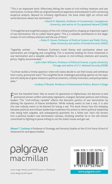 'Shawn T. Cochran's original and insightful work significantly advances our understanding of the domestic politics of war termination and its linkage to civil-military relations. His analysis shows how civil-military bargaining influences the political narrative, and thus the risk calculus of political leaders in wartime. The author advances a new conceptual framework of ideal types for the assignment of blame within the context of failed wars. According to Cochran, civil-military bargaining acts as an important influence for all political leaders in wartime but especially for new leaders, those who come to power after the start of a war. The author makes interesting counter-intuitive arguments, including that new leaders remain at risk for being blamed and punished for a failed war someone else started. Cochran also challenges the widely accepted argument that civilians will be more committed to ending a protracted war than military leaders, and the related assumption that protracted wars are more likely in states with weak civilian control over the armed forces. This study is highly recommended for academic and military professional readers and others interested in how wars end.' - Stephen J. Cimbala, Professor of Political Science, Pennsylvania State University, USA and author of Arms for Uncertainty: Nuclear Weapons in US and Russian Security Policy (2013)