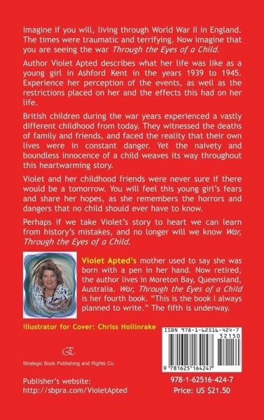 Imagine if you will, living through World War II in England. The times were traumatic and terrifying. Now imagine that you are seeing the war Through the Eyes of a Child. Author Violet Apted describes what her life was like as a young girl in Ashford Kent in the years 1939 to 1945. Experience her perception of the events, as well as the restrictions placed on her and the effects this had on her life. British children during the war years experienced a vastly different childhood from today. They witnessed the deaths of family and friends, and faced the reality that their own lives were in constant danger. Yet the naivety and boundless innocence of a child weaves its way throughout this heartwarming story. Violet and her childhood friends were never sure if there would be a tomorrow. You will feel this young girl's fears and share her hopes, as she remembers the horrors and dangers that no child should ever have to know. Perhaps if we take Violet's story to heart we can learn from history's mistakes, and no longer will we know War, Through the Eyes of a Child. Violet Apted's mother used to say she was born with a pen in her hand. Now retired, the author lives in Moreton Bay, Queensland, Australia. War, Through the Eyes of a Child is her fourth book. "This is the book I always planned to write." The fifth is underway. Publisher's website: http://sbpra.com/VioletApted
