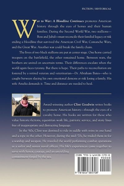 WINNER! *Silver award in the 2020 Feathered Quill Book Awards Program for the Animal - Adult category *and a Finalist in the Historical category! War to War: A Bloodline Continues promotes American history through the eyes of horses and their human families. During the Second World War, two stallions-Boss and Jubal-must reconcile their familial legacy or risk ending a bloodline that survived the American Civil War, Comanche Wars, and the Great War. Another war could break the family chain. The lives of two black stallions are put at center stage. One horse carried troopers on the battlefield, the other remained home. Between wars, the brothers are united on uncertain terms. Their differences escalate when the world again faces tyranny. But there is hope. Their paths to reconciliation are fostered by a retired veteran and veterinarian-Dr. Abraham Bates-who is caught between slaying his own emotional demons or risk losing a family. His wife Amelia demands it. Time and distance are needed to heal.