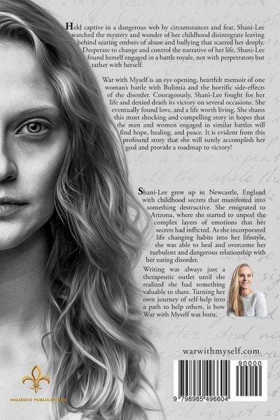 Held captive in a dangerous web by circumstances and fear, Shani-Lee watched the mystery and wonder of her childhood disintegrate leaving behind searing embers of abuse and bullying that scarred her deeply. Desperate to change and to control the narrative of her life, Shani-Lee found herself engaged in a battle royale, not with perpetrators but rather with herself. War with Myself is an eye opening, heartfelt memoir of one woman's struggle with Bulimia and the horrific side-effects of the disorder. Courageously, Shani-Lee fought for her life and denied death its victory on several occasions. She eventually found love and a life worth living. She shares this most shocking and compelling story in hopes that the men and women engaged in similar battles will find hope, healing and peace. It is evident from this profound story that she will surely accomplish her goal and provide a roadmap to victory!