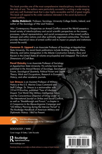 1. The Nature of War 2. The Evolution of War 3. The War Machine (Bureaucracy and the Political Economy) 4. War and Social Stratification 5. Human Costs of War 6. Cultural Representations of War 7. War of Today and Tomorrow 8. Peace and Anti-War Movements