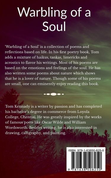 'Warbling of a Soul' is a collection of poems and reflections based on life. In his first poetry book, Tom adds a mixture of haikus, tankas, limericks and acrostics to flavor his writings. Most of his poems are based on the emotions and feelings of the soul. He has also written some poems about nature which shows that he is a lover of nature. Though some of his poems are small, one can eminently enjoy reading this book.