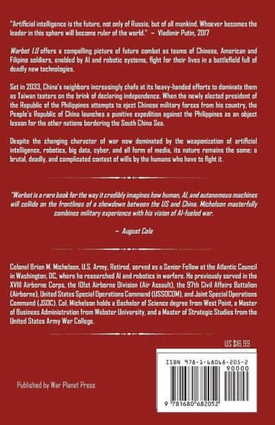 "Artificial intelligence is the future, not only of Russia, but of all mankind. Whoever becomes the leader in this sphere will become ruler of the world." ~ Vladimir Putin, 2017 Warbot 1.0 offers a compelling picture of future combat as teams of Chinese, American and Filipino soldiers, enabled by AI and robotic systems, fight for their lives in a battlefield full of deadly new technologies. Set in 2033, China's neighbors increasingly chafe at its heavy-handed efforts to dominate them. Taiwan teeters on the brink of declaring independence. When the newly elected president of the Republic of the Philippines attempts to eject Chinese military forces from his country, the People's Republic of China launches a punitive expedition against the Philippines as an object lesson for the other nations bordering the South China Sea. Despite the changing character of war now dominated by the weaponization of artificial intelligence, robotics, big data, cyber, and all form of media, its nature remains the same: a brutal, deadly, and complicated contest of wills by the humans who have to fight it.