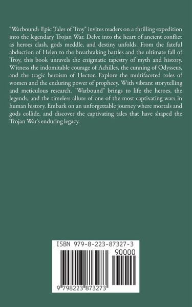 "Warbound: Epic Tales of Troy" invites readers on a thrilling expedition into the legendary Trojan War. Delve into the heart of ancient conflict as heroes clash, gods meddle, and destiny unfolds. From the fateful abduction of Helen to the breathtaking battles and the ultimate fall of Troy, this book unravels the enigmatic tapestry of myth and history. Witness the indomitable courage of Achilles, the cunning of Odysseus, and the tragic heroism of Hector. Explore the multifaceted roles of women and the enduring power of prophecy. With vibrant storytelling and meticulous research, "Warbound" brings to life the heroes, the legends, and the timeless allure of one of the most captivating wars in human history. Embark on an unforgettable journey where mortals and gods collide, and discover the captivating tales that have shaped the Trojan War's enduring legacy.
