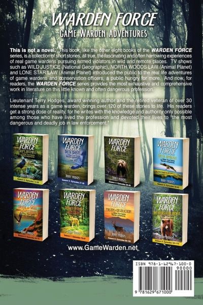 This is not a novel. This book, like the other eight books of the WARDEN FORCE series, is a collection of short stories, all true, the fascinating and often harrowing experiences of real game wardens pursuing armed violators in wild and remote places. TV shows such as WILD JUSTICE (National Geographic), NORTH WOODS LAW (Animal Planet) and LONE STAR LAW (Animal Planet) introduced the public to the real-life adventures of game wardens and conservation officers, a public hungry for more. And now, for readers, the WARDEN FORCE series provides the most exhaustive and comprehensive work in literature on this little known and often dangerous profession. Award winning author Terry Hodges was himself a California State Fish and Game warden and supervisor/leader of game wardens for over 30 intense years. He writes with the authority possible only by those who have actually lived the life, who have actually packed a badge and a gun on behalf of wildlife and battled all manner of wildlife-destroying outlaws. Season 1 contains the first 13 episodesThe Midnight Ride of Bonnie and Clyde: Wardens tangle with a murderous mother-and-son poaching team. Night Rider: A California warden pursues highly dangerous night-poachers of wild pigs. Decisions: Wardens off the coast of Southern California's Catalina Island risk their lives to save the crew of a sinking commercial squid-fishing boat. A Second Second Chance: A California game warden ambushes outlaw catfish fishermen using baby swallows for bait. The Collectors: California wardens take on a nest of Nazi-worshiping, weapons-collecting, deer poaching outlaws. Nothin' Personal: California wardens track down a thief who steals the head and antlers of another hunter's buck. Bottom Feeders: California wardens go after a band of white-trash, sturgeon-poaching hillbillies with attitudes. An Outing with Team Taylor: A California game warden and his family, on a short vacation, team up to capture antelope, bear and steelhead poachers. Rookie: A rookie California game warden gets his first taste of his hazardous new career. Grand Trickery: A California warden employs a magnificent bluff to catch outlaws night-poaching deer. Tough Luck on the Little Sur: California wardens pursue gaunch-hook steelhead poachers. Serial Poacher: Wardens pursue a disturbing and dangerous lone-wolf deer poacher. The Vision: A boy's fondest dream comes true. "Hodges is a gifted writer able to let you imagine you are right there experiencing the workings of California's game wardens. I have read most of his books and thoroughly enjoy his writing. He is able to capture factual events mixed with creativity to describe events in a manner that puts you there. Anyone who enjoys the outdoors will appreciate this book."- John Johnson