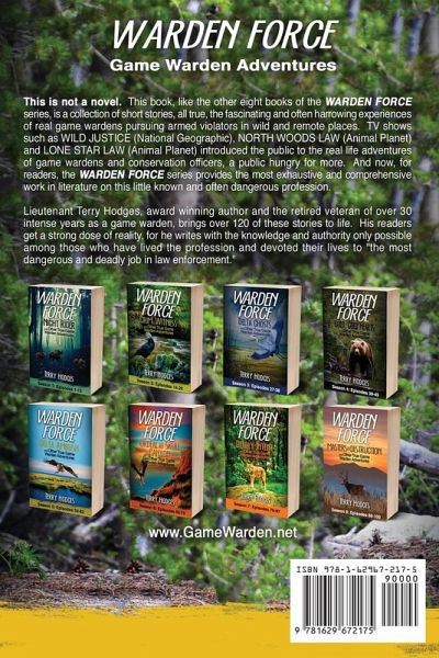 This is not a novel. This book, like the other eight books of the WARDEN FORCE series, is a collection of short stories, all true, the fascinating and often harrowing experiences of real game wardens pursuing armed violators in wild and remote places. TV shows such as WILD JUSTICE (National Geographic), NORTH WOODS LAW (Animal Planet) and LONE STAR LAW (Animal Planet) introduced the public to the real-life adventures of game wardens and conservation officers, a public hungry for more. And now, for readers, the WARDEN FORCE series provides the most exhaustive and comprehensive work in literature on this little known and often dangerous profession. Lieutenant Terry Hodges, award winning author and the retired veteran of over 30 intense years as a game warden, brings over 120 of these stories to life. His readers get a strong dose of reality, for he writes with the knowledge and authority only possible among those who have lived the profession and devoted their lives to "the most dangerous and deadly job in law enforcement." Season Nine Includes Fourteen Episodes: Not Bad for a Fish Cop: A lone warden, during two consecutive nights, outsmarts two criminals and makes two unrelated felony arrests. Fuzz-Face, Snake Eyes and Fu Manchu: The unscrupulous camp host of a high-mountain campground employs three bow-hunting criminals to take out a camp-raiding dumpster bear. Repeat Offenders: An aging warden recounts his long history of capturing the same salmon and deer poachers time after time. Swift Justice: Fleeing salmon poachers run afoul of poisonous plants and relentless wardens. The Worst of the Worst: Determined wardens spend months bringing down a band of smart, super-wary, deer poachers, among the worst in California history. Masters of Deception: A husband and wife poaching team prove to be unskilled game-law violators and even worse liars. Trouble in Hog Heaven: The cruel and unscrupulous operators of a big-money pig-hunting club are targeted by determined wardens. The Cycle: Wardens outsmart a well-organized team of abalone poachers. The Caviar Connection: A team of undercover wardens stalk a ring of sturgeon-poaching caviar dealers. The Old Pro: A crafty old warden, a master of his trade, dazzles a much younger warden by outsmarting and capturing two hardened deer poachers. Zero Choice: A lone warden, nearly gunned down by a fugitive dope grower, reassesses his approach to his hazardous occupation. Death on Snake Mountain: A warden performs a nerve-jangling search of a mountain home said to contain dozens of free-roaming rattlesnakes and a two-week-dead human body. Confession: A young warden nearly kills a man and keeps a secret for over 30 years. Heartless Bastard: A warden comes out second best when he tangles with a man with no legs.