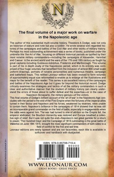 The final volume of a major work on warfare in the Napoleonic age The author of this substantial multi-volume history, Theodore A Dodge, was not only an historian of stature and note but also a soldier. He wrote several well regarded histories of the campaigns and battles of the Civil War and other works of military history. Perhaps his most outstanding achievement was a series of books, published under the umbrella title 'the Art of War,' focusing on different historical periods as typified by their most notable military commanders-including the campaigns of Alexander, Hannibal and Caesar in the ancient world and the wars of the 17th and 18th century as fought by great captains including Gustavus Adolphus, Frederick and Marlborough. This volume is part of his in depth study of the Napoleonic period, which in its entirety was comprised of four huge volumes that benefited from the inclusion of almost 800 small scale uniform drawings, portraits of notable personalities and numerous theatre, campaign and battlefield maps. This retitled Leonaur edition has been revised to form volumes of approximately equal size reformatted to enable us to enlarge all the illustrations and maps for the benefit of the reader. This series is an excellent history of the campaigns and battles of the Napoleonic Age but it goes far beyond the historical record. Dodge critically examines the strategies and tactics of all the military commanders in such a clear and authoritative manner that the student of military history can clearly understand the errors of those about to suffer defeat and the expertise-or in the case of Napoleon Bonaparte, the military genius-of the victors. This is an invaluable guide to warfare in the age of Napoleon and is highly recommended. This final volume of Dodge's brilliant account of the 'art of war' in the Napoleonic Age concludes with the period to the end of the First Empire when the fortunes of the imperial allies turned in their favour and Napoleon and his forces, weakened by reverses, were unable to contain them. Napoleon's brilliance in the campaigns of 1814 showed that he was still an incomparable grand commander on the field of battle, especially in engagements when the odds were against him. The war had turned to one of attrition so the Empire fell, the emperor abdicated, the Bourbon monarchy was restored and Europe breathed a collective sigh of relief. But it was not quite the end-Napoleon's last great gamble for a return to power, 'The Hundred Days' and the Campaign of 1815 culminating in the great battle of Waterloo on June 18th 1815, brought the most significant commanders of both sides to a field of conflict for the first and last time. Leonaur editions are newly typeset and are not facsimiles; each title is available in softcover and hardback with dustjacket.