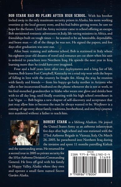 Bob Stark had no plans after high school. With his brother locked away in the only maximum-security prison in Alaska, his mom working overtime at the local grocery store, and his bad habits getting worse, he saw no hope for the future. Until the Army recruiter came to school offering an escape. Bob envisioned romantic adventures in Italy, life-saving missions in Africa, and friendships built on tough times - he wanted to be an honorable, dependable, and brave man - all of the things he was not. He signed the papers, and five days after graduation was sent out. After basic training and airborne school, Bob is stationed in Italy where his eighteen-year-old dreams of travel and romance are cut short when his unit is ordered to parachute into Northern Iraq. He spends the next year in Iraq learning more than he could have ever imagined. Four and a half years later, after two deployments and a long list of life lessons, Bob leaves Fort Campbell, Kentucky on a road trip west with the hopes of falling in love with the country he fought for. Along the way, he reunites with family and friends - from his happy-go-lucky mother in Arizona who talks to her incarcerated husband on the phone whenever she is not at work, to his foul-mouthed grandmother in Idaho who wears one glove and drinks beer with ice all day long, until finally reuniting with his high school sweetheart in Las Vegas - Bob begins a new chapter of self-discovery and acceptance that just may allow him to be the man he always wanted to be. Warflower is a coming-of-age story about family traditions, brotherhood, and one boy's journey into manhood without a father to teach him.