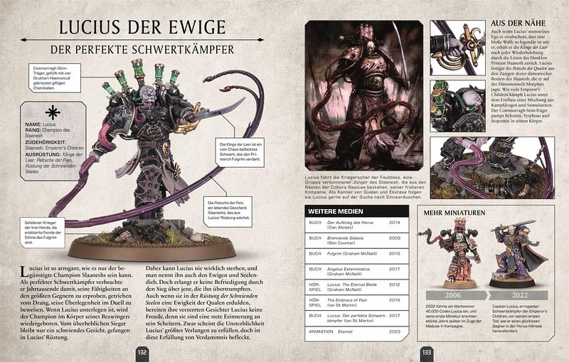 Jeder Steckbrief bildet die Warhammer Figur in all ihrer Pracht ab und beschreibt den Protagonisten bis ins allerkleinste Detail - ergänzt durch Zeitleisten, prägnante Zitate sowie Nahaufnahmen, auf denen jedes Rüstungsdetail sichtbar wird.