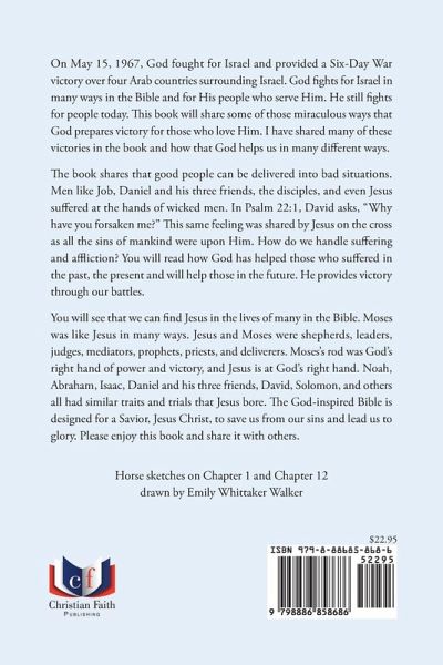 On May 15, 1967, God fought for Israel and provided a Six-Day War victory over four Arab countries surrounding Israel. God fights for Israel in many ways in the Bible and for His people who serve Him. He still fights for people today. This book will share some of those miraculous ways that God prepares victory for those who love Him. I have shared many of these victories in the book and how that God helps us in many different ways. The book shares that good people can be delivered into bad situations. Men like Job, Daniel and his three friends, the disciples, and even Jesus suffered at the hands of wicked men. In Psalm 22:1, David asks, "Why have you forsaken me?'' This same feeling was shared by Jesus on the cross as all the sins of mankind were upon Him. How do we handle suffering and affliction? You will read how God has helped those who suffered in the past, the present and will help those in the future. He provides victory through our battles. You will see that we can find Jesus in the lives of many in the Bible. Moses was like Jesus in many ways. Jesus and Moses were shepherds, leaders, judges, mediators, prophets, priests, and deliverers. Moses's rod was God's right hand of power and victory, and Jesus is at God's right hand. Noah, Abraham, Isaac, Daniel and his three friends, David, Solomon, and others all had similar traits and trials that Jesus bore. The God-inspired Bible is designed for a Savior, Jesus Christ, to save us from our sins and lead us to glory. Please enjoy this book and share it with others.
