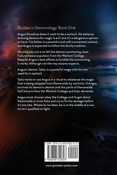 Angus Donohue doesn't want to be a warlock. He believes draining demons for magic is evil, but it's a dangerous opinion to have--his father is a powerful and well-connected warlock, and Angus is expected to follow the family tradition. His only way out is to fail the demon summoning class. Failure means expulsion from the Warlock College. Despite Angus's best efforts to fumble the summoning, it works. Although not the way anyone expects. Angus's demon, Saka, is a powerful mage with his own need for a warlock. Saka wants to use Angus in a ritual to rebalance the magic that is being stripped from Demonside by warlocks. If Angus survives his demon's desires and the perils of Demonside, he'll have to face the Warlock College and their demands. Angus must choose: obey the College and forget about Demonside or trust Saka and try to fix the damage before it's too late. Whatever he does, he is in the middle of a war he isn't qualified to fight.