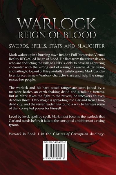 Swords, Spells, Stats and Slaughter! Mark wakes up in a burning town inside a Full Immersion Virtual Reality RPG called Reign of Blood. He flees from the reiver slavers who are abducting the village’s NPCs, only to have an agonizing encounter with the wrong end of a ranger’s arrow. After trying and failing to log out of this painfully realistic game, Mark decides to take up his sword, embrace his new Warlock character class, and help the ranger rescue her people. The warlock and his hard-nosed ranger are soon joined by a macabre healer, an earth-shaking druid and a talking fortress. But as Mark takes the fight to the reivers, he uncovers an even deadlier threat. Dark magic is spreading into Garland from a long dead city, and the reiver leader has found a way to harness some of that corrupted power for himself. Level by level, spell by spell, Mark must become the warlock that Garland needs before it falls to the corrupted ambitions of a rising tyrant. If you love… Visceral combat Lovecraftian monsters Ancient ruins Swords and sorcery Completely original spells ...then Warlock: Reign of Blood is for you! Warlock is Book 1 in the Chasms of Corruption duology.