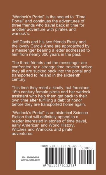 "Warlock's Portal" is the sequel to "Time Portal" and continues the adventures of three friends who travel back in time for another adventure with pirates and warlock's. Jeff Davis and his two friends Rusty and the lovely Carole Anne are approached by a messenger bearing a letter addressed to him from nearly 300 years in the past. The three friends and the messenger are confronted by a strange time traveler before they all are sucked back into the portal and transported to Ireland in the sixteenth century. This time they meet a kindly, but ferocious 16th century female pirate and her warlock assistant who help them get back to their own time after fulfilling a debt of honor before they are transported home again. "Warlock's Portal" is an historical Science Fiction that will definitely appeal to a reader interested in stories of time travel, early American and World History, Witches and Warlocks and pirate adventures.