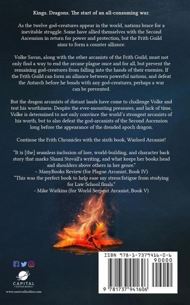 Kings. Dragons. The start of an all-consuming war. As the twelve god-creatures appear in the world, nations brace for a inevitable struggle. Some have allied themselves with the Second Ascension in return for power and protection, but the Frith Guild aims to form a counter alliance. Volke Savan, along with the other arcanists of the Frith Guild, must not only find a way to end the arcane plague once and for all, but prevent the remaining god-creatures from falling into the hands of their enemies. If the Frith Guild can form an alliance between powerful nations, and defeat the Autarch before he bonds with any god-creatures, perhaps a war can be prevented. But the dragon arcanists of distant lands have come to challenge Volke and test his worthiness. Despite the ever-mounting pressures, and lack of time, Volke is determined to not only convince the world's strongest arcanists of his worth, but to also defeat the god-arcanists of the Second Ascension long before the appearance of the dreaded apoch dragon. Continue the Frith Chronicles with the sixth book, Warlord Arcanist! Praise for the Frith Chronicles! "Perfect for those who enjoy the Codex Alera series, the Homas Wildus series and the Harry Potter series. Stovall is quickly becoming a name I look for." - Seattle Book Review (for Knightmare Arcanist, Book I) "Dread Pirate Arcanist is a brilliant novel from start to finish." - Coffee Pot Book Club (for Dread Pirate Arcanist, Book II) "Marvelously entertaining!" - The Prairies Book Review (for Coliseum Arcanist, Book III) "It is [the] seamless inclusion of lore, world-building, and character back story that marks Shami Stovall's writing, and what keeps her books head and shoulders above others in her genre." - ManyBooks Review (for Plague Arcanist, Book IV) "This was the perfect book to help ease my stress/fatigue from studying for Law School finals." - Mike Watkins (for World Serpent Arcanist, Book V)