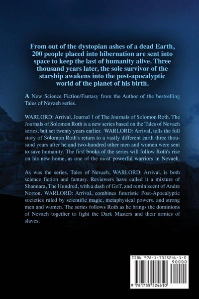 From out of the dystopian ashes of a dead Earth, 200 people placed into hibernation are sent into space to keep the last of humanity alive. Three thousand years later, the sole survivor of that star ship awakens into the post-apocalyptic world of the planet of his birth --A New Science Fiction/Fantasy from the Author of the best selling Tales of Nevaeh series. WARLORD: Arrival, Journal 1 of The Journals of Solomon Roth --The Journals of Solomon Roth is a new series based on the Tales of Nevaeh series, but set twenty years earlier. WARLORD: Arrival, tells the full story of Solomon Roth's return to a vastly different earth three thousand years after he and two-hundred other men and women were sent to save humanity. The first books of the series will follow Roth's rise on his new home, as one of the most powerful warriors in Nevaeh. --As was the series, Tales of Nevaeh, WARLORD: Arrival, is both science fiction and fantasy. Reviewers have called it a mixture of Shannara, The Hundred, with a dash of GoT thrown in as well, and reminiscent of Andre Norton. WARLORD: Arrival, combines futuristic Post-Apocalyptic societies ruled by scientific magic, metaphysical powers, and strong men and women. The series follows Roth as he brings the dominions of Nevaeh together to fight the Dark Masters and their armies of slaves. ¿