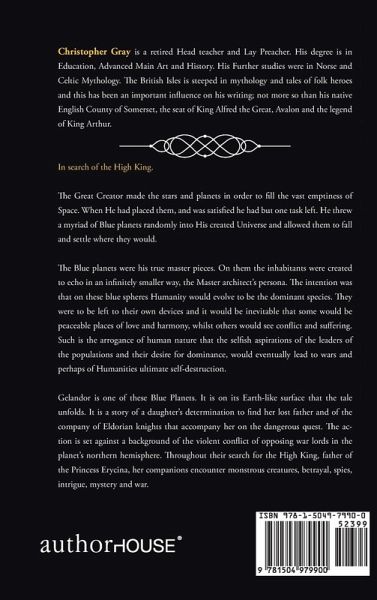 In search of the High King. The Great Creator made the stars and planets in order to fill the vast emptiness of Space. When He had placed them, and was satisfied he had but one task left. He threw a myriad of Blue planets randomly into His created Universe and allowed them to fall and settle where they would. The Blue planets were his true master pieces. On them the inhabitants were created to echo in an infinitely smaller way, the Master architect's persona. The intention was that on these blue spheres Humanity would evolve to be the dominant species. They were to be left to their own devices and it would be inevitable that some would be peaceable places of love and harmony, whilst others would see conflict and suffering. Such is the arrogance of human nature that the selfish aspirations of the leaders of the populations and their desire for dominance, would eventually lead to wars and perhaps of Humanities ultimate self-destruction. Gelandor is one of these Blue Planets. It is on its Earth-like surface that the tale unfolds. It is a story of a daughter's determination to find her lost father and of the company of Eldorian knights that accompany her on the dangerous quest. The action is set against a background of the violent conflict of opposing war lords in the planet's northern hemisphere. Throughout their search for the High King, father of the Princess Erycina, her companions encounter monstrous creatures, betrayal, spies, intrigue, mystery and war.