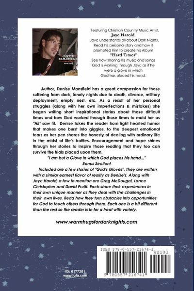 Author, Denise has a great compassion for those suffering from lonely nights due to death, divorce, military deployment, empty nest, etc. As a result of her personal struggles (along with her own imperfections and mistakes) she began to write short inspirational stories about these difficult times and how God worked through these times to mold her as "HE" saw fit. Denise takes the reader from light hearted humorous laughter to the deepest emotional tears as her pen shares the honesty of dealing with ordinary life in the midst of life's battles. Bonus Section! Stories also included by Jayc Harold, Greg McDougal, Lance Christopher and David Pruitt. They share their experiences as they deal with the challenges in their own lives, turning those obstacles into opportunities for God to touch others through them. Features Christian Country Music Artist, Jayc Harold. Jayc understands all about Dark Nights. Read his personal story and how it prompted him to create his Album "Hard Times".
