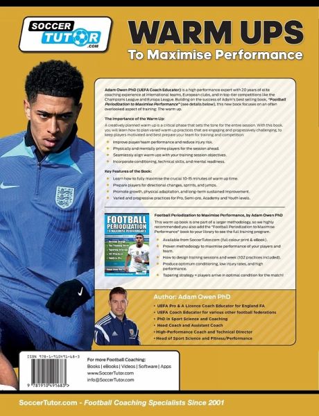 Warm Ups from a World Leading High Performance Expert to Maximise the Performance of Your Players and Team Following the success of his best-selling book, "Football Periodization to Maximise Performance," and his unparalleled expertise in football science and performance coaching, Adam Owen PhD (High Performance Expert and UEFA Pro & A License Educator) now focuses on optimising the warm up phase of training for coaches at all levels. Key Benefits of this Book for Coaches: Strategic Planning: Learn to plan engaging and progressively challenging warm up practices tailored to your team's needs. Targeted Preparation: Discover how to adapt warm ups for specific training days to prime players physically and mentally. Alignment with Objectives: Seamlessly integrate warm ups with session objectives, incorporating conditioning, technical skills, and mental readiness. Injury Prevention: Reduce the risk of injuries by using the correct warm up types and intensity for specific training days. Motivation and Performance: Keep players motivated and enhance individual and team performance. Learn How to Improve Player/Team Performance: Maximise Warm Up Time: Make the most of the crucial 10-15 minutes with varied and effective warm up practices. Comprehensive Approach: Different types of warm ups for resistance, speed endurance, reaction, and pre-match activation are needed to address various aspects of player readiness. Physical Preparation: Prepare players for the physical demands of the session/game, including directional changes, sprints, and jumps. Long-Term Benefits: Encourage growth, physical adaptation, and sustained improvement suitable for all levels - from youth to professional. Warm Ups from a World Leading High Performance Expert to Maximise the Performance of Your Players and Team 116 Pages Full Colour 50 Practices Youth- Pro Level Included Practice Examples: Resistance: "Crossfire" Passing, Agility, and Speed 4-Corners Technical Warm Up Speed Endurance: Progressive Overload Speed and Agility Exercises Circuit Training Reaction Speed: Passing and Reactions for Speed Work in a 4-Grid Warm Up Activation: Dynamic "Stop &