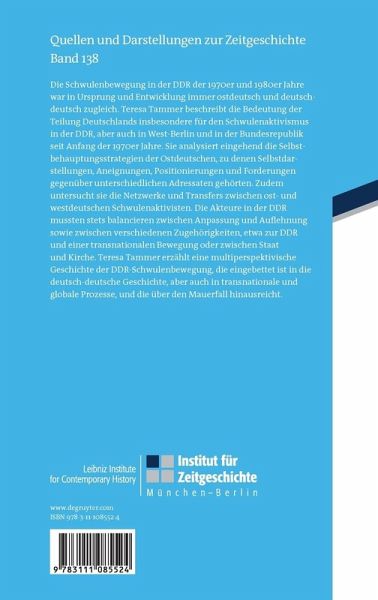Die Schwulenbewegung in der DDR der 1970er und 1980er Jahre war in Ursprung und Entwicklung immer ostdeutsch und deutsch-deutsch zugleich. Teresa Tammer beschreibt die Bedeutung der Teilung Deutschlands insbesondere für den Schwulenaktivismus in der DDR, aber auch in West-Berlin und der Bundesrepublik seit Anfang der 1970er Jahre; sie analysiert eingehend die Selbstbehauptungsstrategien der Ostdeutschen, zu denen Selbstdarstellungen, Aneignungen, Positionierungen und Forderungen gegenüber unterschiedlichen Adressaten gehörten. Zudem untersucht sie die Netzwerke und Transfers zwischen ost- und westdeutschen Schwulenaktivisten. Die Akteure in der DDR mussten stets balancieren zwischen Anpassung und Auflehnung sowie zwischen verschiedenen Zugehörigkeiten, etwa zur DDR und einer transnationalen Bewegung oder zwischen Staat und Kirche. Teresa Tammer erzählt eine multiperspektivische Geschichte der DDR-Schwulenbewegung, die eingebettet ist in die deutsch-deutsche Geschichte, aber auch in transnationale und globale Prozesse, und die über den Mauerfall hinausreicht.