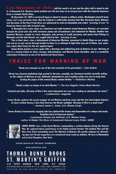The New York Times Bestselling Author of The Marines of Autumn Late November of 1941. Half the world is at war and with the other half about to join in, a thousand U.S. Marines stand sentinel over the last days of an uneasy truce between ourselves and the Imperial Japanese Army in chaotic North China. By November 27, FDR is convinced Japan is about to launch a military action. Washington doesn't know where, isn't sure precisely when. But the Cabinet is sufficiently alarmed that War Secretary Henry Stimson and Secretary of the Navy Frank Knox are authorized to send an immediate and coded "warning of war" to American bases and units in harm's way. In Shanghai two cruise ships are chartered and 800 armed American Marines are marched through the great port city with enormous pomp and circumstance and embarked for Manila. Another 200 Marines, unable to reach Shanghai, and serving in small garrisons and posts from Peking to Mongolia and the Gobi Desert, are caught short by this "warning of war". This is their story. Of how a detachment of American Marines marooned in North China as war erupts, set out on an epic march through hostile territory in an attempt to fight their way out of China and, somehow, rejoin their Corps for the war against Japan. James Brady dazzles us once again with a stunning and unflinching look at America at war. Warning of War is a moving tribute to sheer courage, determination, and Marine Corps discipline, and is a wonderful celebration of America in one of its darkest but finest hours.