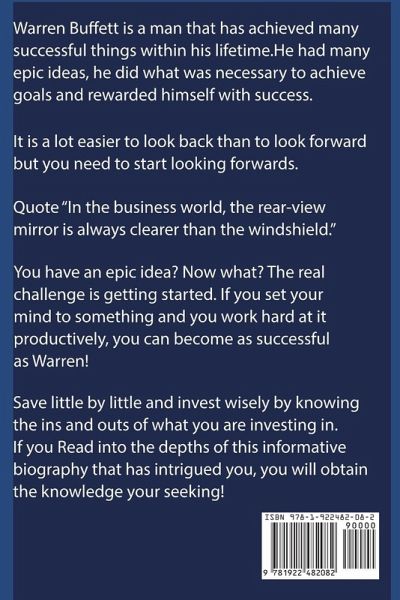 This book covers the topic of Warren Buffett and will teach you about his life and career. If you want to know the ins and outs of a man that has achieved the highest of heights, then this is the right book for you! You will find in great depth a great knowledge base of Warren Buffett and how he became the man he is today. Learn how he started out in the early stages of investing with is Dad at the mere age of 11! Warren wasn't always so rich, he didn't inherit the money, he worked smart to give himself the best opportunity he could to achieve this. You don't get to where you want without working smarter and harder than others, By reading this book you will explore all aspects of the life of Warren Buffett to date and obtain all the knowledge of how Warren achieved what he did. You will find this book to be extremely motivational and inspiring, Warren is quite the intellectual inspiring man that has a lot to give. Motivation and happiness is a huge key to success in Warrens eyes, which is why he does seminars and other events in order to share his knowledge to benefit others and help them get to where he is today. You will find this book has captured his motivational drive, in addition to a bibliography it includes a chapter containing carefully selected motivational quotes from Warren Buffett.