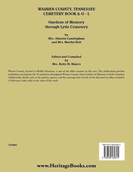 Warren County, located in Middle Tennessee, is one of the older counties in this area. This publication provides tombstone inscriptions for 35 cemeteries throughout Warren County, from Gardens of Memory to Lytle Cemetery. Additionally, details such as the parents, spouse, and the marriage date of each of the deceased are often included. A full-name index adds to the value of this work.