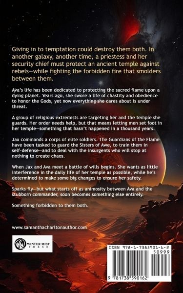 Giving in to temptation could destroy them both. In another galaxy, another time, a priestess and her security chief must protect an ancient temple against rebels-while fighting the forbidden fire that smolders between them. Ava's life has been dedicated to protecting the sacred flame upon a dying planet. Years ago, she swore a life of chastity and obedience to honor the Gods, yet now everything she cares about is under threat. A group of religious extremists are targeting her and the temple she guards. Her order needs help, but that means letting men set foot in her temple-something that hasn't happened in a thousand years. Jax commands a corps of elite soldiers. The Guardians of the Flame have been tasked to guard the Sisters of Awe, to train them in self-defense-and to deal with the insurgents who will stop at nothing to create chaos. When Jax and Ava meet a battle of wills begins. She wants as little interference in the daily life of her temple as possible, while he's determined to make some big changes to ensure her safety. Sparks fly-but what starts off as animosity between Ava and the stubborn commander, soon becomes something else entirely. Something forbidden to them both. WARRIOR FORBIDDEN is a stand-alone Sci-Fi Romance set in a far-off galaxy. The novel takes place in the same story-world as the Galactic Clan Wars series by Samantha Charlton-with epic adventure, unforgettable characters, high-stakes action, and emotional, steamy romance.