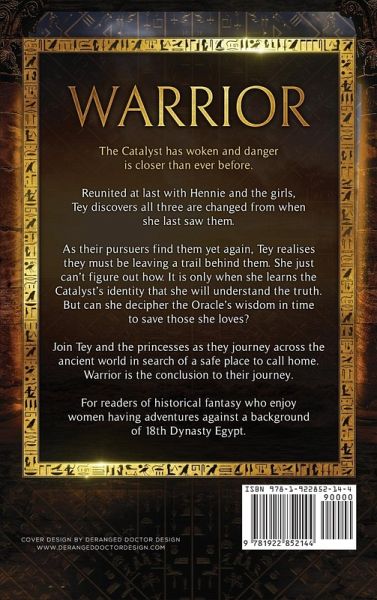 The Catalyst has woken and danger is closer than ever before. Reunited at last with Hennie and the girls, Tey discovers all three are changed from when she last saw them. As their pursuers find them yet again, Tey realises they must be leaving a trail behind them. She just can't figure out how. It is only when she learns the Catalyst's identity that she will understand the truth. But can she decipher the Oracle's wisdom in time to save those she loves? Join Tey and the princesses as they journey across the ancient world in search of a safe place to call home. Warrior provides the conclusion to their journey. For readers of historical fantasy who enjoy women having adventures against a background of 18th Dynasty Egypt.