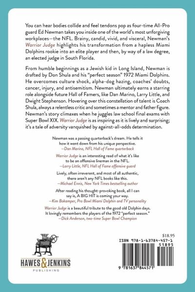 You can hear bodies collide and feel tendons pop as four-time All-Pro guard Ed Newman takes you inside one of the world's most unforgiving workplaces--the NFL. Brainy, candid, vivid, and visceral, Newman's Warrior Judge highlights his transformation from a hapless Miami Dolphins rookie into an elite player and then, by way of a law degree, an elected judge in South Florida. From humble beginnings as a Jewish kid in Long Island, Newman is drafted by Don Shula and his "perfect season" 1972 Miami Dolphins. He overcomes culture shock, alpha-dog hazing, coaches' doubts, cancer, injury, and antisemitism. Newman ultimately earns a starring role alongside future Hall of Famers, like Dan Marino, Larry Little, and Dwight Stephenson. Hovering over this constellation of talent is Coach Shula, always a relentless critic and sometimes a mentor and father figure. Newman's story climaxes when he juggles law school final exams with Super Bowl XIX. Warrior Judge is as inspiring as it is lively and surprising; it's a tale of adversity vanquished by against-all-odds determination. Newman was a passing quarterback's dream. He tells it how it went down from his unique perspective. --Dan Marino, NFL Hall of Fame quarterback Warrior Judge is an interesting read of what it's like to be an offensive lineman in the NFL. --Larry Little, NFL Hall of Fame offensive guard Lively, often irreverent, and most of all authentic, there aren't any NFL books like this. --Michael Ennis, New York Times bestselling author After reading his thought-provoking book, all I can say is, A big hit is coming your way. --Kim Bokamper, Pro Bowl Miami Dolphin and TV personality Warrior Judge is a beautiful tribute to the good old Dolphin days. It lovingly remembers the players of the 1972 "perfect season." --Dick Anderson, two-time Super Bowl Champion