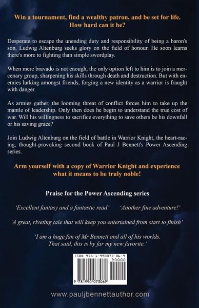 Win a tournament, find a wealthy patron, and be set for life-how hard can it be? Desperate to escape the unending duty and responsibility of being a baron's son, Ludwig Altenburg seeks glory on the field of honour. He soon learns there's more to fighting than simple swordplay. When mere bravado is not enough, the only option left to him is to join a mercenary group, sharpening his skills through death and destruction. But with enemies lurking amongst friends, forging a new identity as a warrior is fraught with danger. As armies gather, the looming threat of conflict forces him to take up the mantle of leadership. Only then does he begin to understand the true cost of war. Will his willingness to sacrifice everything to save others be his downfall or his saving grace? Join Ludwig Altenburg on the field of battle in Warrior Knight, the heart-racing, thought-provoking second book of Paul J Bennett's Power Ascending series. Arm yourself with a copy of Warrior Knight and experience what it means to be truly noble! What readers are saying about Paul J Bennett's books: ¿¿¿¿¿ - "Fantastic Fantasy" ¿¿¿¿¿ - "Fabulously written, loved it." ¿¿¿¿¿ - "Another excellent book series!!" ¿¿¿¿¿ - "Wow! Best book I've read in a LONG time!" ¿¿¿¿¿ -"Thoroughly absorbing, exciting and mystical" ¿¿¿¿¿ - "If you like fantasy fiction, then this is a must-read!" ¿¿¿¿¿ - "This story gripped me and kept me turning the pages." ¿¿¿¿¿ - "Action, Intrigue, Adventure, Romance and some twists!" ¿¿¿¿¿ - "I love the book, had me on edge and could not put it down!" ¿¿¿¿¿ - "The most amazing adventure with a strong magical influence." ¿¿¿¿¿ - "The characters you love in the books come to life in such a fabulous way" ¿¿¿¿¿ - "The tale flows effortlessly along, blending action, adventure and heartwarming scenes." ¿¿¿¿¿ - "It's really difficult to stop reading these books. Looking forward to more books from this author." Other Books by Paul J Bennett Heir to the Crown Series: Battle at the River - Prequel Servant of the Crown Sword of the Crown Mercerian Tales: Stories of the Past Heart of the Crown Shadow of the Crown Mercerian Tales: The Call of Magic Fate of the Crown Burden of the Crown Mercerian Tales: The Making of a Man Defender of the Crown Fury of the Crown Mercerian Tales: Honour Thy Ancestors War of the Crown Triumph of the Crown The Frozen Flame Series: The Awakening/Into the Fire - Prequels Ashes Embers Flames Inferno Frost Power Ascending Series: Tempered Steel - Prequel Temple Knight Warrior Knight Temple Captain Warrior Lord The Chronicles of Cyric: Into the Maelstrom - Prequel A Midwinter Murder The Beast of Brunhausen