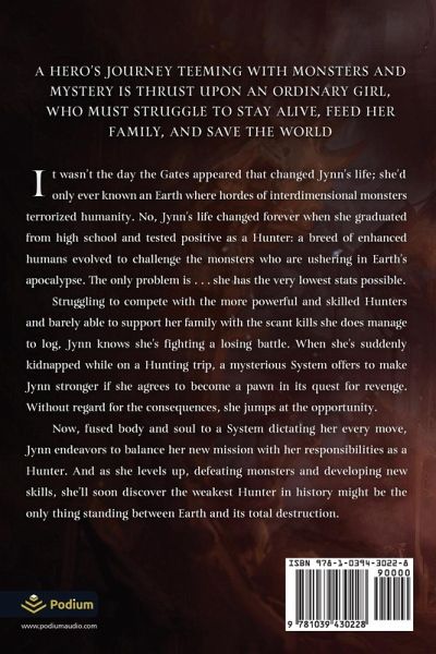 A hero's journey teeming with monsters and mystery is thrust upon an ordinary girl, who must struggle to stay alive, feed her family, and save the world. It wasn't the day the Gates appeared that changed Jynn's life; she'd only ever known an Earth where hordes of interdimensional monsters terrorized humanity. No, Jynn's life changed forever when she graduated from high school and tested positive as a Hunter: a breed of enhanced humans evolved to challenge the monsters who are ushering in Earth's apocalypse. The only problem is . . . she has the very lowest stats possible. Struggling to compete with the more powerful and skilled Hunters and barely able to support her family with the scant kills she does manage to log, Jynn knows she's fighting a losing battle. When she's suddenly kidnapped while on a Hunting trip, a mysterious System offers to make Jynn stronger if she agrees to become a pawn in its quest for revenge. Without regard for the consequences, she jumps at the opportunity. Now, fused body and soul to a System dictating her every move, Jynn endeavors to balance her new mission with her responsibilities as a Hunter. And as she levels up, defeating monsters and developing new skills, she'll soon discover the weakest Hunter in history might be the only thing standing between Earth and its total destruction. The first volume of the hit LitRPG adventure series-with almost 600,000 views on Royal Road-now available on Kindle, Kindle Unlimited, and Audible!