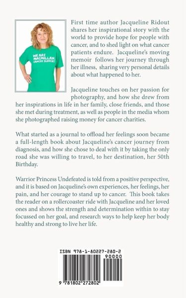First time author Jacqueline Ridout shares her inspirational story with the world to provide hope for people with cancer, and to shed light on what cancer patients endure. Jacqueline's moving memoir follows her journey through her illness, sharing very personal details about what happened to her. Jacqueline touches on her passion for photography, and how she drew from her inspirations in life in her family, close friends, and those she met during treatment, as well as people in the media whom she photographed raising money for cancer charities. What started as a journal to offload her feelings soon became a full-length book about Jacqueline's cancer journey from diagnosis, and how she chose to deal with it by taking the only road she was willing to travel, to her destination, her 50th Birthday. Warrior Princess Undefeated is told from a positive perspective, and it is based on Jacqueline's own experiences, her feelings, her pain, and her courage to stand up to cancer. This book takes the reader on a rollercoaster ride with Jacqueline and her loved ones and shows the strength and determination within to stay focussed on her goal, and research ways to help keep her body healthy and strong to live her life.