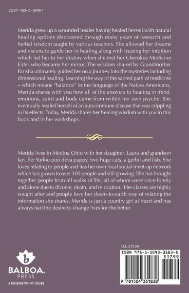 Merida grew up a wounded healer having healed herself with natural healing options discovered through many years of research and herbal wisdom taught by various teachers. She allowed her dreams and visions to guide her in healing along with trusting her intuition which led her to her destiny when she met her Cherokee Medicine Elder who became her mirror. The wisdom shared by Grandmother Parisha ultimately guided her on a journey into the mysteries including dimensional healing. Learning the way of the sacred path of medicine - which means "balance" in the language of the Native Americans, Merida shares with you how all of the answers to healing in mind, emotions, spirit and body came from within her own psyche. She eventually healed herself of an auto-immune disease that was crippling in its effects. Today, Merida shares her healing wisdom with you in this book and in her workshops.