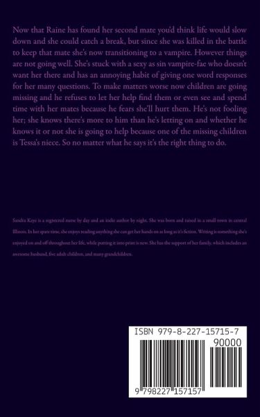 Now that Raine has found her second mate you'd think life would slow down and she could catch a break, but since she was killed in the battle to keep that mate she's now transitioning to a vampire. However things are not going well. She's stuck with a sexy as sin vampire-fae who doesn't want her there and has an annoying habit of giving one word responses for her many questions. To make matters worse now children are going missing and he refuses to let her help find them or even see and spend time with her mates because he fears she'll hurt them. He's not fooling her; she knows there's more to him than he's letting on and whether he knows it or not she is going to help because one of the missing children is Tessa's niece. So no matter what he says it's the right thing to do.