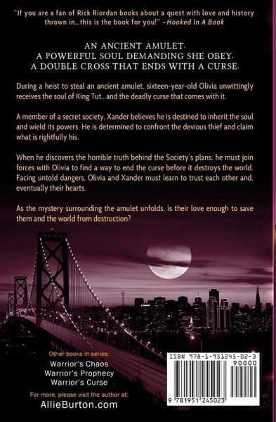 An ancient amulet. A powerful soul demanding she obey. A double cross that ends with a curse. During a heist to steal an ancient amulet, sixteen-year-old Olivia unwittingly receives the soul of King Tut…and the deadly curse that comes with it. A member of a secret society, Xander believes he is destined to inherit the soul and wield its powers. He is determined to confront the devious thief and claim what is rightfully his. When he discovers the horrible truth behind the Society’s plans, he must join forces with Olivia to find a way to end the curse before it destroys the world. Facing untold dangers, Olivia and Xander must learn to trust each other and, eventually their hearts. As the mystery surrounding the amulet unfolds, is their love enough to save them and the world from destruction? "If you are a fan of Rick Riordan books about a quest with love and history thrown in…this is for you!" – Hooked In A Book Review (Originally published as Soul Slam) Other books in series: Warrior’s Chaos, Warrior’s Prophecy, Warrior’s Curse