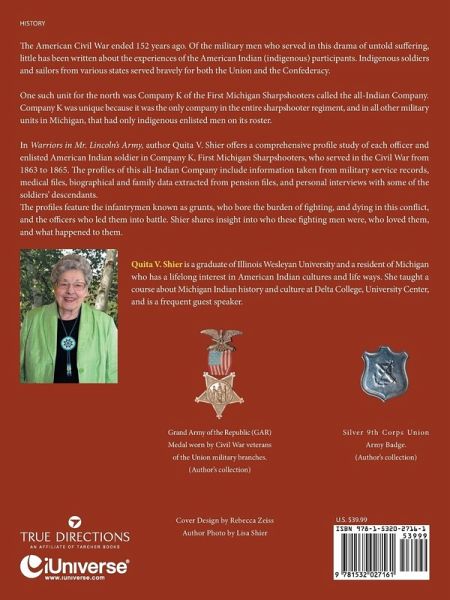 The American Civil War ended 152 years ago. Of the military men who served in this drama of untold suffering, little has been written about the experiences of the American Indian (indigenous) participants. Indigenous soldiers and sailors from various states served bravely for both the Union and the Confederacy. One such unit for the north was Company K of the First Michigan Sharpshooters called the all-Indian Company. Company K was unique because it was the only company in the entire sharpshooter regiment, and in all other military units in Michigan, that had only indigenous enlisted men on its roster. In Warriors in Mr. Lincolns Army, author Quita V. Shier offers a comprehensive profile study of each officer and enlisted American Indian soldier in Company K, First Michigan Sharpshooters, who served in the Civil War from 1863 to 1865. The profiles of this all-Indian Company include information taken from military service records, medical files, biographical and family data extracted from pension files, and personal interviews with some of the soldiers descendants. The profiles feature the infantrymen known as grunts, who bore the burden of fighting, and dying in this conflict, and the officers who led them into battle. Shier shares insight into who these fighting men were, who loved them, and what happened to them.