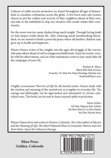 Cultures of noble warrior protectors are found throughout all ages of humankind in countless civilizations across the globe. A few brave men and women choose to put the welfare and security of their neighbors ahead of their own, and take to the battlefield to stop any invaders who would violate their community. For the aware warrior, many clashes bring much insight. Through facing death we find deeper truths about life. After enduring much heartbreaking bloodshed, we are moved to build a powerful peace where all families' children may grow up in health and happiness. Wayne Omura writes of his insights into the ages-old struggle of the warrior who puts others ahead of self on dangerous battlefronts. Enjoy his words, wrestle with his observations, and see what realizations come to your mind after all the campaigns of your life. Stephen K. Hayes Black Belt Hall of Fame Founder, To-Shin Do Ninja Heritage Martial Arts StephenKHayes.com I highly recommend Warriors of Life for all martial artists. Omura deals with the wisdom and meaning of the martial arts as it applies to everyday life. The sayings and philosophy can be approached and interpreted in various individual ways. This book can be used to hone anyone's path to perfection. Heinz Schlue 5th Dan Nippon Kan Aikido 5th Dan Shin Go Ju Ryu Karate 3rd Dan Yawara Jutsu Wayne Omura lives and writes in Denver, Colorado. He is the author of Movies and the Meaning of Life: The Most Profound Films in Cinematic History and Zen Foot-Notes: Upon the Unknown Passage.