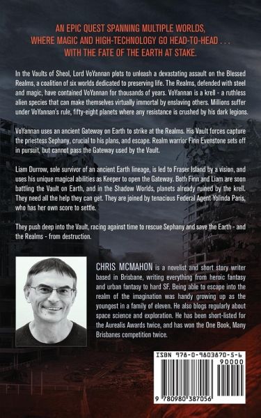 An epic quest spanning multiple worlds, where magic and high-technology go head-to-head . . . with the fate of the Earth at stake. In the Vaults of Sheol, Lord VoYannan plots to unleash a devastating assault on the Blessed Realms, a coalition of six worlds dedicated to preserving life. The Realms, defended with steel and magic, have contained VoYannan for thousands of years. VoYannan is a krell - a ruthless alien species that can make themselves virtually immortal by enslaving others. Millions suffer under VoYannan's rule, fifty-eight planets where any resistance is crushed by his dark legions. VoYannan uses an ancient Gateway on Earth to strike at the Realms. His Vault forces capture the priestess Sephany, crucial to his plans, and escape. Realm warrior Finn Evenstone sets off in pursuit, but cannot pass the Gateway used by the Vault. Liam Durrow, sole survivor of an ancient Earth lineage, is led to Fraser Island by a vision, and uses his unique magical abilities as Keeper to open the Gateway. Both Finn and Liam are soon battling the Vault on Earth, and in the Shadow Worlds, planets already ruined by the krell. They need all the help they can get. They are joined by tenacious Federal Agent Yolinda Paris, who has her own score to settle. They push deep into the Vault, racing against time to rescue Sephany and save the Earth - and the Realms - from destruction.
