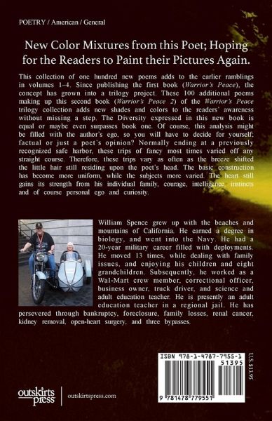 This new collection of poems is the next 100 in the Warrior's Peace Trilogy (Warrior's Peace 2). Life continues on this road that allows us to travel both in light and dark. This endeavor has provided the continuing motivational drive that allowed his first book (Warrior's Peace) to be published in 2015 and to finish the final touches on this book (Warrior's Peace 2) in 2016. These two will place over 300 personal poems on the world market in both digital and paperback formats. The third iteration in the trilogy will additionally include short stories written over the past twenty years for your consideration and hopefully enjoyment. Again readers will experience the dark and brooding starts down his rabbit holes of life. In his opinion success is maybe more gauged by an individual's mental ability to confront daily adversity, then by actual participating in just physical interactions. Always remember to follow the bread crumbs always he left along the paths that light the way back to what has been for him a relatively happy daily existence. Poetry is a winding road through many times the diversity experienced and in tis author's case is never a straight line to anywhere. Just enjoy the exploration of the mental curves that appear going about anywhere at any time. That is why the conclusions should never seem to ever be along the same exact course. Welcome back to this peace of a many times turbulent mind.