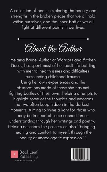 ""Helen Lazenby Author of Warriors and Broken Pieces, has spent most of her adult life battling with mental health issues and difficulties surrounding childhood trauma. Using her own experiences and the observations made of those she has met fighting battles of their own, Helen attempts to highlight some of the thoughts and emotions that we often keep hidden in the darkest moments. Aiming to shine a light for those who may be in need of some connection or understandin through her writings and poetry. Helen describes the process as also """"bringing healing and comfort to myself, through the beauty of unapologetic expression """".""