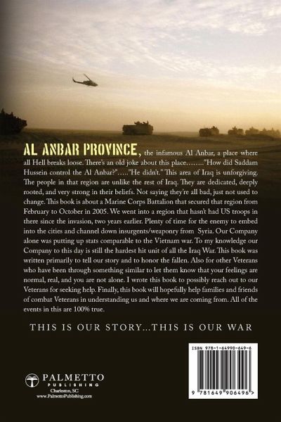 Al Anbar Province, the infamous Al Anbar, a place where all Hell breaks loose. There's an old joke about this place........"How did Saddam Hussein control the Al Anbar?"....."He didn't." This area of Iraq is unforgiving. The people in that region are unlike the rest of Iraq. They are dedicated, deeply rooted, and very strong in their beliefs. Not saying they're all bad, just not used to change. This book is about a Marine Corps Battalion that secured that region from February to October in 2005. We went into a region that hasn't had US troops in there since the invasion, two years earlier. Plenty of time for the enemy to embed into the cities and channel down insurgents/weaponry from Syria. Our Company alone was putting up stats comparable to the Vietnam war. To my knowledge our Company to this day is still the hardest hit unit of all the Iraq War. This book was written primarily to tell our story and to honor the fallen. Also for other Veterans who have been through something similar to let them know that your feelings are normal, real, and you are not alone. I wrote this book to possibly reach out to our Veterans for seeking help. Finally, this book will hopefully help families and friends of combat Veterans in understanding us and where we are coming from. All of the events in this are 100% true. THIS IS OUR STORY...THIS IS OUR WAR
