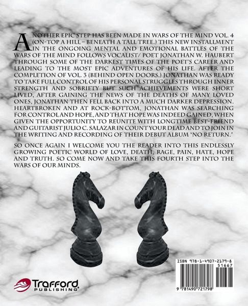 ANOTHER EPIC STEP HAS BEEN MADE IN WARS OF THE MIND VOL. 4 (ON-TOP A HILL - BENEATH A TALL TREE.) THIS NEW INSTALLMENT IN THE ONGOING MENTAL AND EMOTIONAL BATTLES OF THE WARS OF THE MIND FOLLOWS VOCALIST/ POET JONATHAN W. HAUBERT THROUGH SOME OF THE DARKEST TIMES OF THE POET'S CAREER AND LEADING TO THE MOST EPIC ADVENTURES OF HIS LIFE. AFTER THE COMPLETION OF VOL. 3 (BEHIND OPEN DOORS.) JONATHAN WAS READY TO TAKE FULL CONTROL OF HIS PERSONAL STRUGGLES THROUGH INNER STRENGTH AND SOBRIETY BUT SUCH ACHIEVEMENTS WERE SHORT LIVED, AFTER GAINING THE NEWS OF THE DEATHS OF MANY LOVED ONES, JONATHAN THEN FELL BACK INTO A MUCH DARKER DEPRESSION. HEARTBROKEN AND AT ROCK-BOTTOM, JONATHAN WAS SEARCHING FOR CONTROL AND HOPE, AND THAT HOPE WAS INDEED GAINED, WHEN GIVEN THE OPPORTUNITY TO REUNITE WITH LONGTIME BEST-FRIEND AND GUITARIST JULIO C. SALAZAR IN COUNT YOUR DEAD AND TO JOIN IN THE WRITING AND RECORDING OF THEIR DEBUT ALBUM "NO RETURN." SO ONCE AGAIN I WELCOME YOU THE READER INTO THIS ENDLESSLY GROWING POETIC WORLD OF LOVE, DEATH, RAGE, PAIN, HATE, HOPE AND TRUTH. SO COME NOW AND TAKE THIS FOURTH STEP INTO THE WARS OF OUR MINDS.