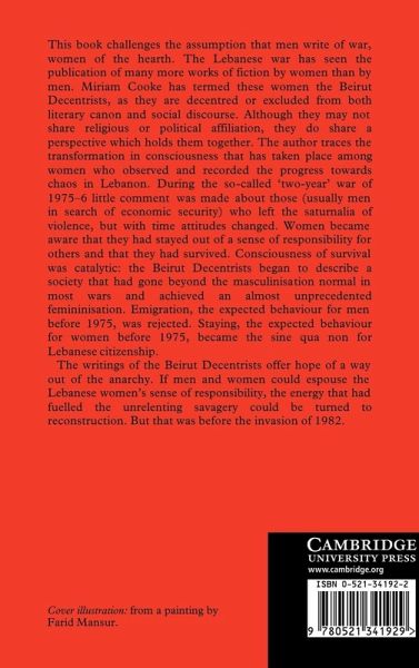 This book challenges the assumption that men write of war, women of the hearth. The Lebanese war has seen the publication of many more works of fiction by women than by men. Miriam Cooke has termed these women the Beirut Decentrists, as they are decentred or excluded from both literary canon and social discourse. Although they may not share religious or political affiliation, they do share a perspective, which holds them together. The author traces the transformation in consciousness that has taken place among women who observed and recorded the progress towards chaos in Lebanon. During the so-called 'two-year' war of 1975-6 little comment was made about those (usually men in search of economic security) who left the saturnalia of violence, but with time attitudes changed. Women became aware that they had stayed out of a sense of responsibility for others and that they had survived. Consciousness of survival was catalytic: the Beirut Decentrists began to describe a society that had gone beyond the masculinisation normal in most wars and achieved an almost unprecedented fernininisation. Emigration, the expected behaviour for men before 1975, was rejected. Staying, the expected behaviour for women before 1975, became the sine qua non for Lebanese citizenship. The writings of the Beirut Decentrists offer hope of a way out of the anarchy. If men and women could espouse the Lebanese women's sense of responsibility, the energy that had fuelled the unrelenting savagery could be turned to reconstruction. But that was before the invasion of 1982.