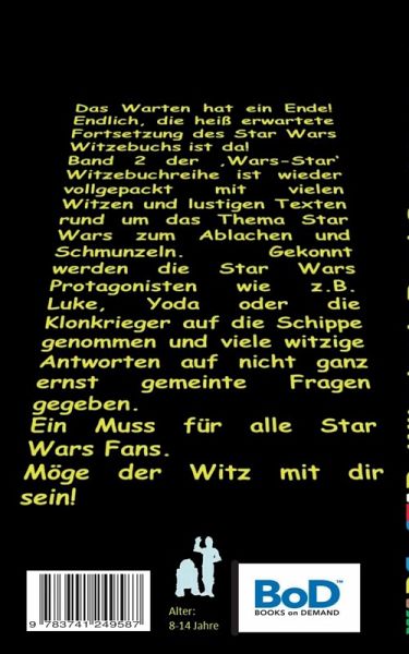 Das Warten hat ein Ende! Endlich, die heiß erwartete Fortsetzung des Star Wars Witzebuchs ist da! Band 2 der Wars-Star Witzebuchreihe ist wieder vollgepackt mit vielen Witzen und lustigen Texten rund um das Thema Star Wars zum Ablachen und Schmunzeln. Gekonnt werden die Star Wars Protagonisten wie z.B. Luke, Yoda oder die Klonkrieger auf die Schippe genommen und viele witzige Antworten auf nicht ganz ernst gemeinte Fragen gegeben. Ein Muss für alle Star Wars Fans. Möge der Witz mit dir sein! Altersempfehlung: 8-14 Jahre