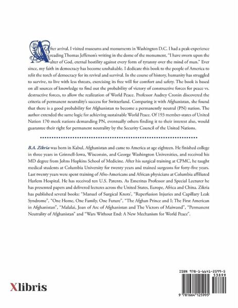 After arrival, I visited museums and monuments in Washington D.C. I had a peak-experience reading Thomas Jefferson's writing in the dome of the monument, "I have sworn upon the alter of God, eternal hostility against every form of tyranny over the mind of man." Ever since, my faith in democracy has become unshakable. I dedicate this book to the people of America to relit the torch of democracy for its revival and survival. In the course of history, humanity has struggled to survive, to live with less threats, exercising its free will for comfort and safety. The book is based on all sources of knowledge to find out the probability of victory of constructive forces for peace vs. destructive forces, to allow the realization of World Peace. Professor Audrey Cronin discovered the criteria of permanent neutrality's success for Switzerland. Comparing it with Afghanistan, she found that there is a good probability for Afghanistan to become a permanently neutral (PN) nation. The author extended the same logic for achieving sustainable World Peace. Of 193 member-states of United Nation 170 meek nations demanding PN, eventually others finding it to their interest also, would guarantee their right for permanent neutrality by the Security Council of the United Nations.